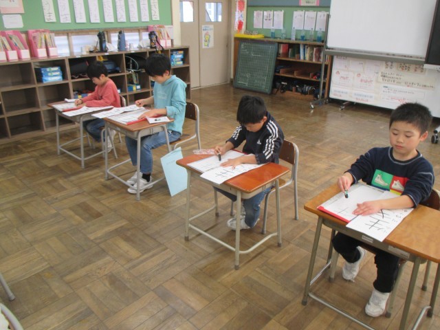 1月8日の校内書初大会に向けて、手本をよく見てじっくりと字を書きました。