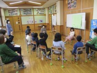 1年生に招待され、あきあそびランドへ行ってきました。松ぼっくりやどんぐり、木の実や枝などを生かしたおもちゃや遊びが用意されており、遊び方の説明を聞き、楽しそうに活動していました。