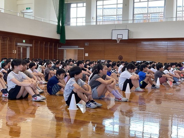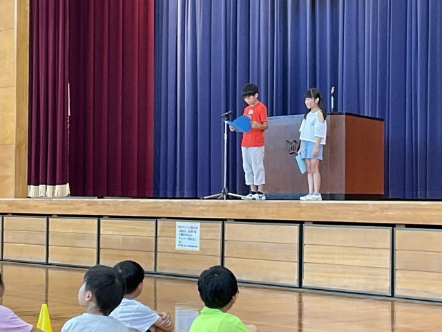 終業式では、代表児童が1学期の自分のがんばりや取組について振り返り、全校の前でスピーチをしました。また、代表以外の子供たちは、学年の仲間のがんばりを真剣に聞いていました。