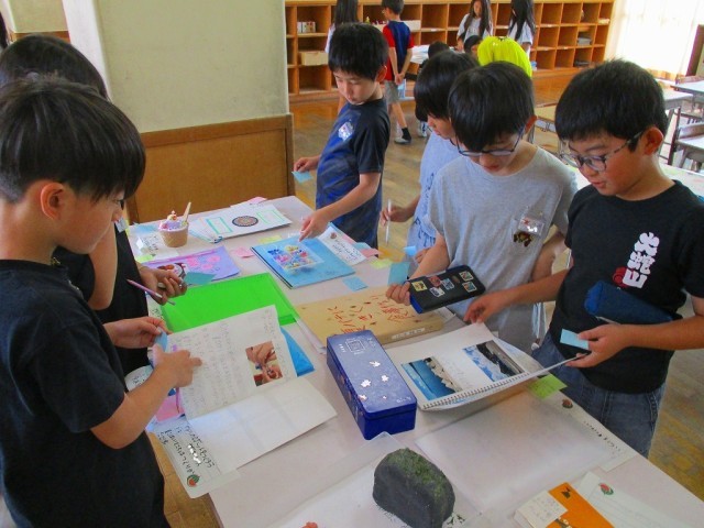 3年生は、夏休みに作成した自由研究を互いに見合い、付箋に感想を書いて伝えました。それぞれの研究に興味深そうに触れていました。