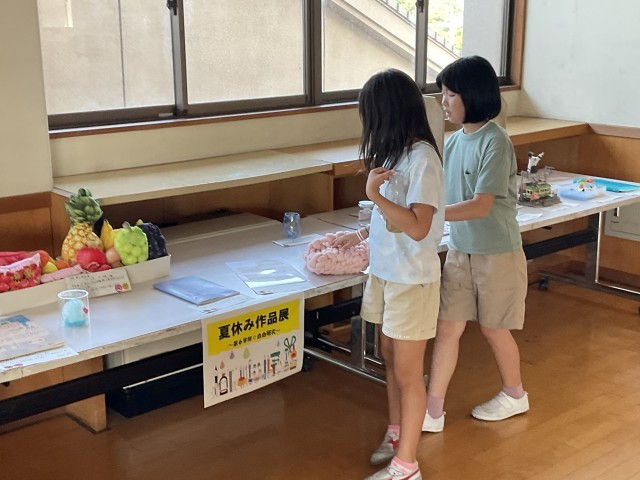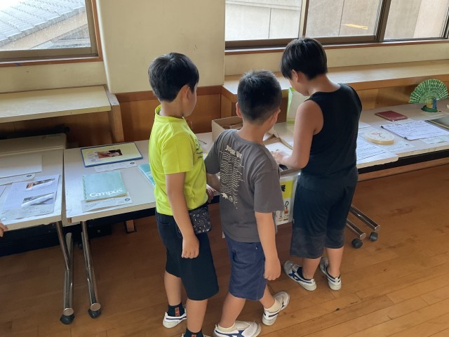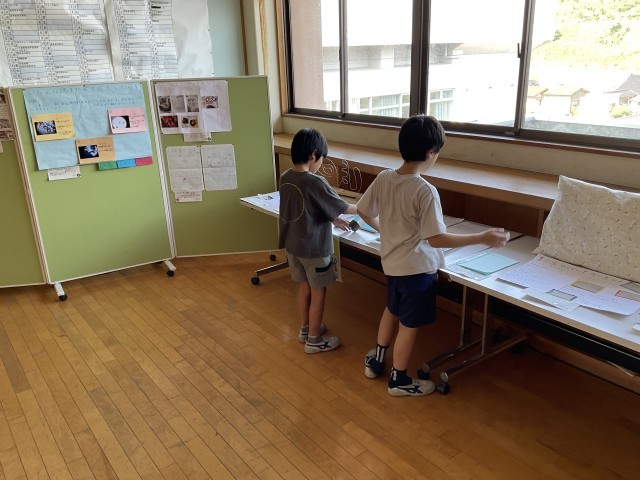 各学年の自由研究を見学しています。上学年のものを見て来年度の参考にしたり、下学年のものでも「すごい」と思える研究があったりしたようです。