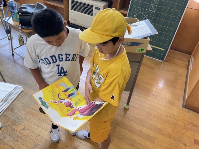先週借りた本を返し、今週読む本を借りに行きました。教室に戻ると、おもしろそうな本があったと紹介している子がいました。
