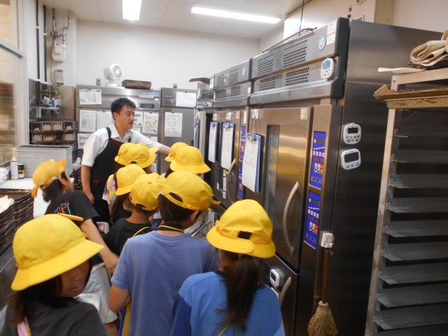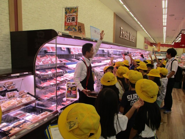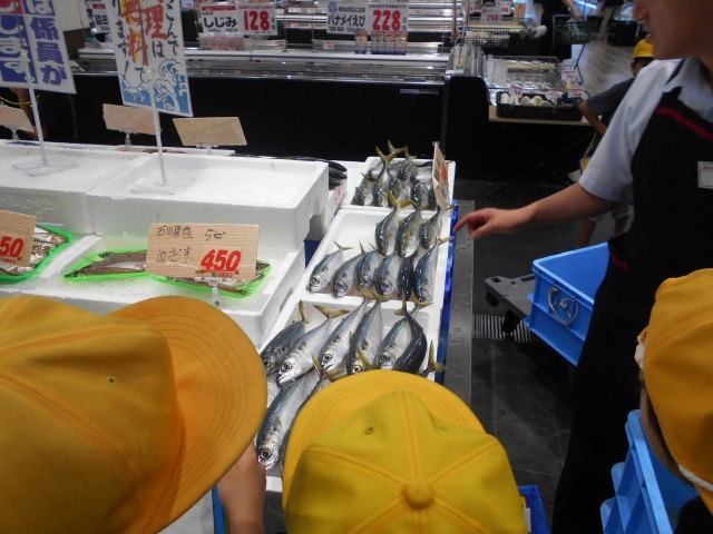 スーパーマーケットでは、普段見ることのできないバックヤードを見ることができました。魚を捌く人や総菜を調理する人、パンを焼く人など、スーパーマーケットではいろいろな仕事をしている人がいることを知ることができました。熱心にメモを取りながら話を聞いている様子が印象的でした。