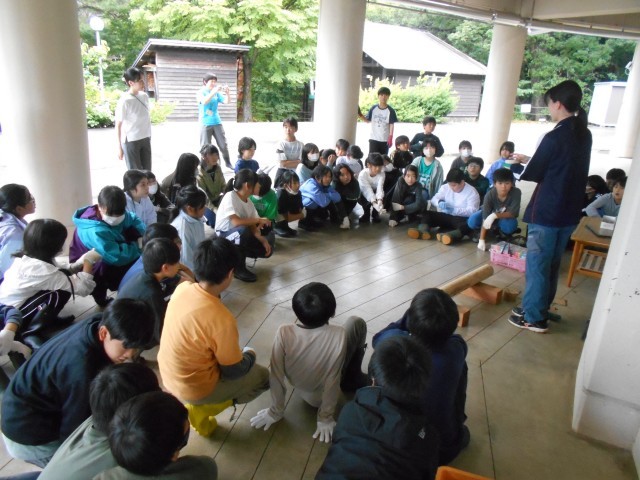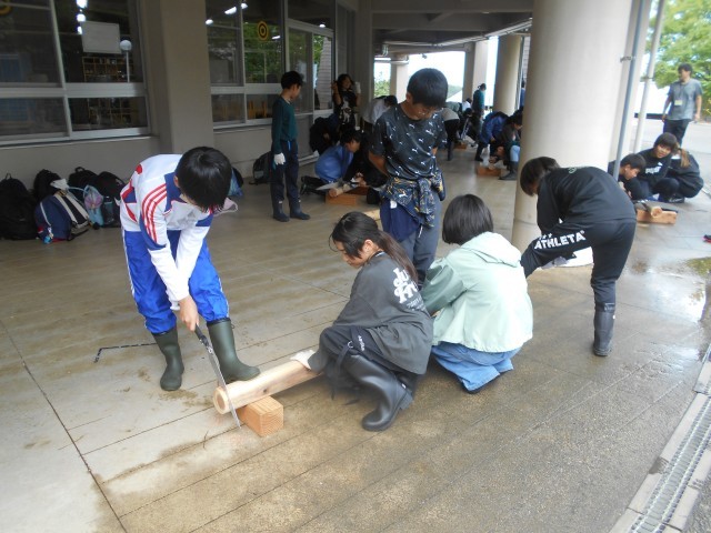 1日目の午前中は、雨天バージョンの日程でした。コースター作りでは、丸太を真っすぐ切ったり、焼き印を押したりしました。自分だけのオリジナルのデザインを考え、すてきな作品が完成しました。班の仲間と声をかけ合いながら取り組み、後片付けでも自分から率先して掃除をするなど、進んで活動することができました。