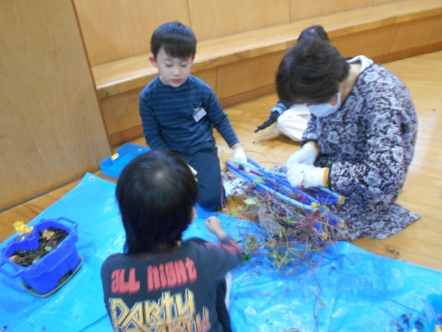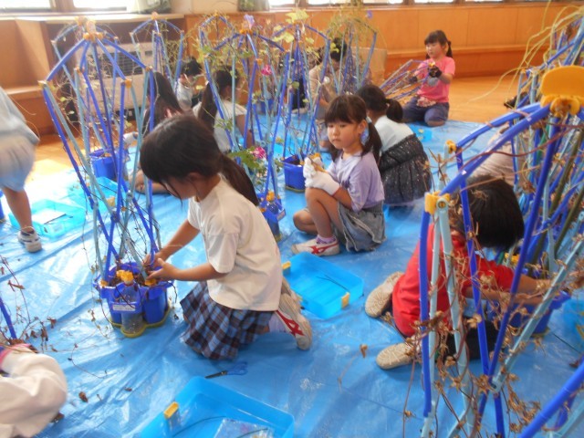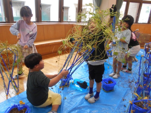 1学期に植えて育てていたあさがおは、花が咲き、種ができ、秋色に変わってきました。今日は、あさがおのつるを支柱からとって、あさがおリースを作りました。保護者ボランティアの方にも協力いただき、リースができました。ボランティアの皆様、ありがとうございました。この後、飾り付けを行います。仕上がりが楽しみです。