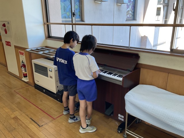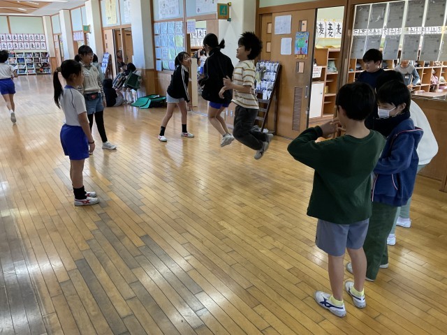 休み時間の様子です。なわとびの近くに、一人二人と仲間が集まってきました。