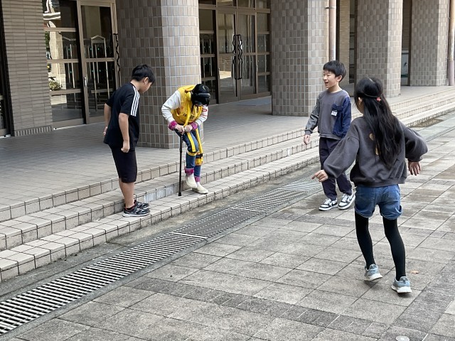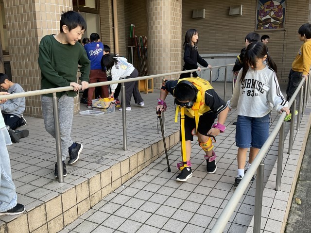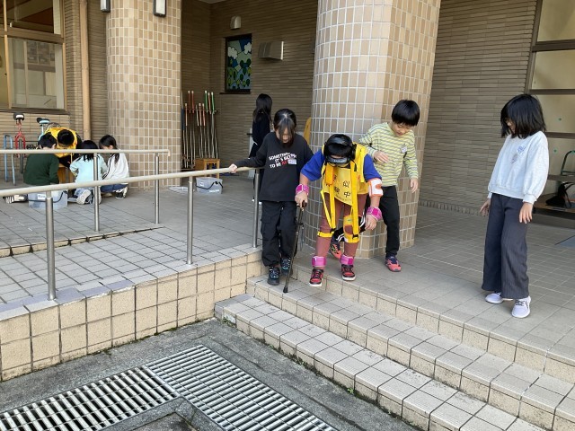 総合では、福祉について学習しています。手足に重りを着け、視界を狭くし、制限をかけた状態でスロープや段差を上ったり下りたりしてみました。