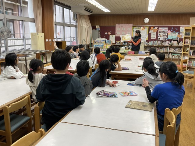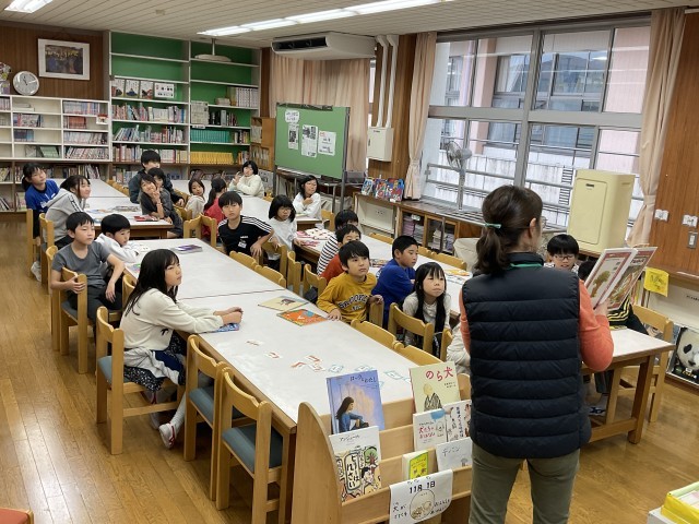 司書の先生に、本の貸出と読み聞かせをしてもらいました。先生におすすめの本を聞いたり、国語の教科書に載っている話の本を探したりする姿が見られました。