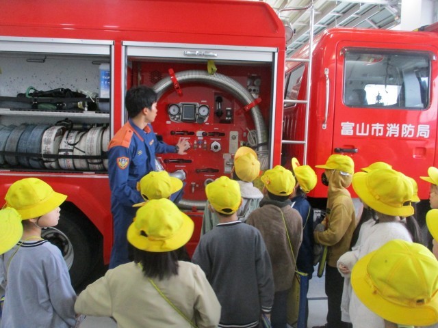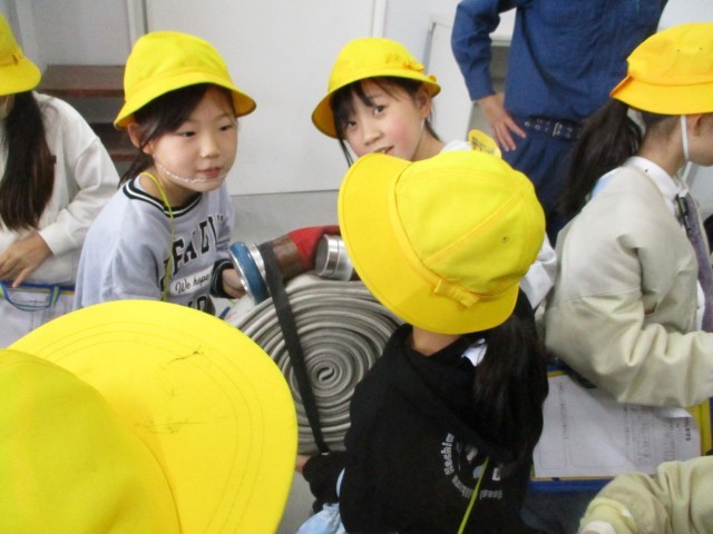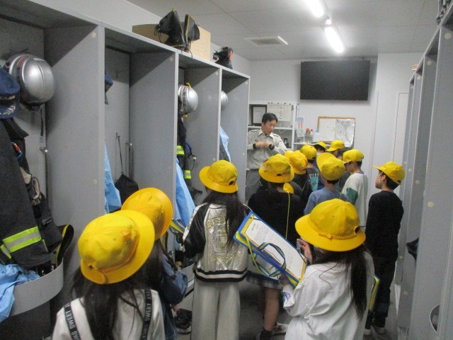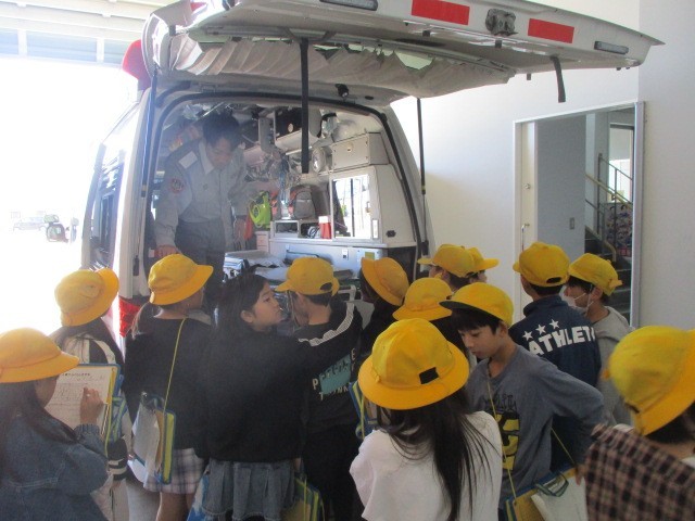 昨日は1組が、今日は2組が消防署に見学に行きました。消防車や救急車の内部を見せてもらったり、設備を詳しく説明してもらったりしました。出動したときだけでなく、出動していないときに何をしているかも知ることができました。見学して学んだことをこれからの学習に生かしていきます。