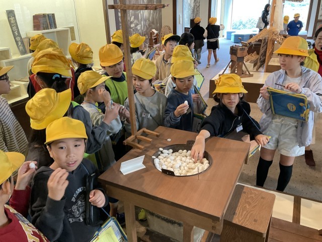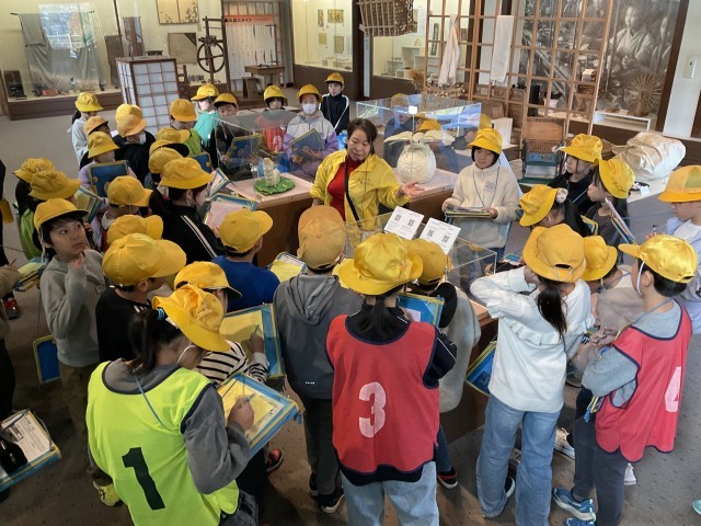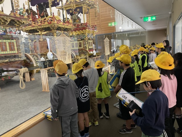曳山会館では、施設の方に曳山の造りや歴史、どのようにして八尾の町が栄えていったのかを説明していただきました。子供たちも分からないことや気になったことを質問していました。