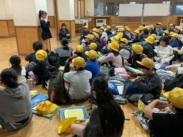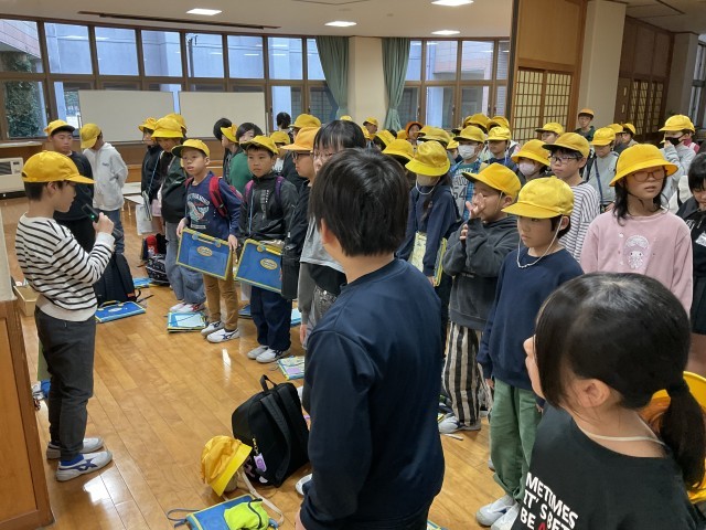 校外学習から戻り、帰校式を行いました。和紙づくり体験や見学、買い物など思い出に残る1日になったようです。