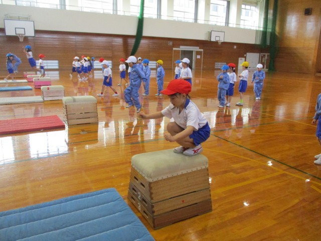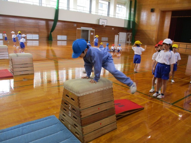 跳び箱で大切な動きを取り入れた準備運動を行い、自分に合った高さの跳び箱を使って開脚跳びに挑戦しました。手の平をしっかりつけることや両足をそろえて跳ぶことを、楽しみながら学ぶことができました。「もっと跳びたい」と、やる気満々な子供たちでした。