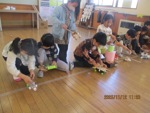 空き容器やペットボトル等、思い思いの材料を使って、ゴムで走る車「ゴムゴムカー」を作っています。「まっすぐ走らせたい」「遠くまで走らせたい」と願い、試行錯誤しながら工夫を凝らしています。