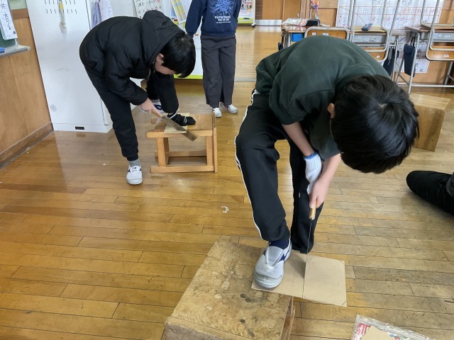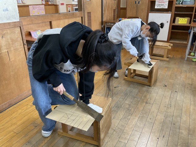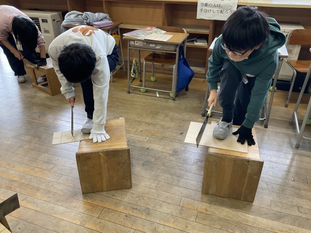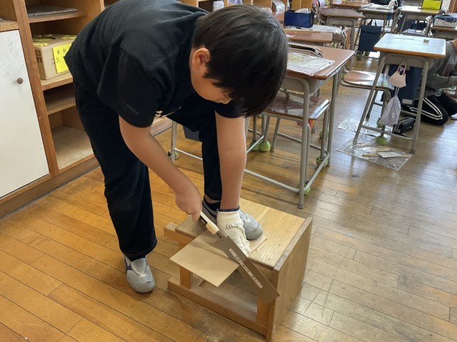 図工では、板に書いた線に合わせてのこぎりで切る活動を進めています。使い慣れない道具に悪戦苦闘する姿も・・・。自分の体や周りの人を傷付けないように気を付けながら、活動しています。