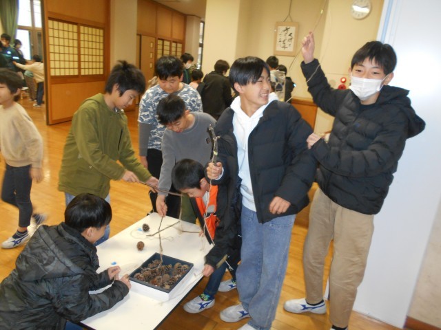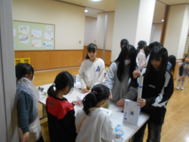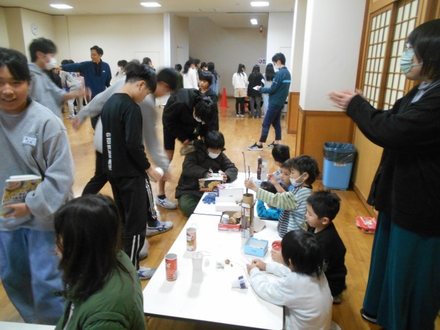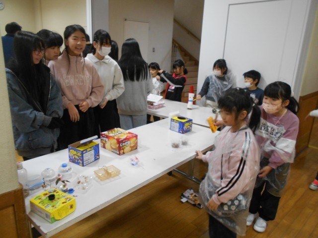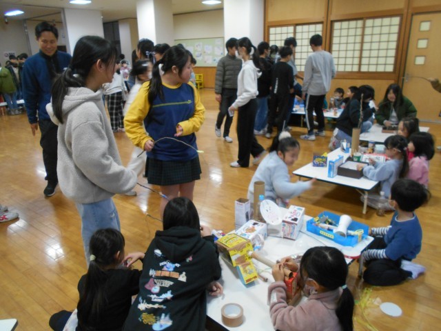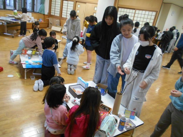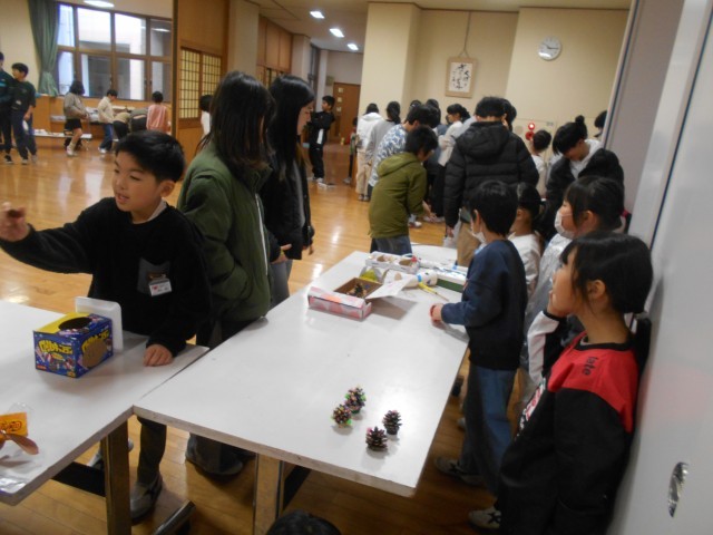 1年生から招待を受けて、大休憩に1階の多目的スペースに遊びに行った6年生。たくさんのお店に、いろいろなおもちゃが並べられていて、お店には行列ができていました。福引のおもちゃや動物を見つけるお店など、秋の葉っぱや枝、松ぼっくりなどを使って作られたおもちゃコーナーがたくさんありました。どのお店も大盛況でした。1年生に誘われて、6年生も嬉しそうに遊んでいました。