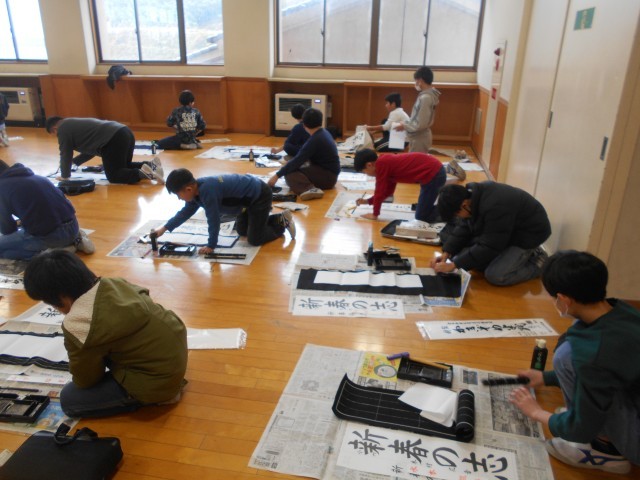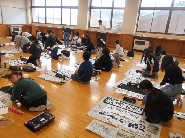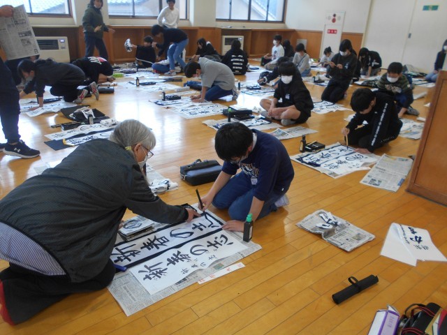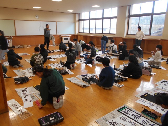 今年も、特別講師の先生の指導のもと、書き初めの練習が始まりました。手本や、先生が準備してくださった手書きの名札を見ながら、みんな真剣に字を書いていました。