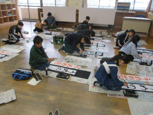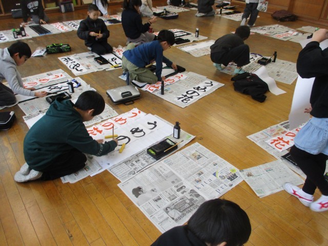 今日から3学期が始まりました。書初大会では、3年生は「うめの花」と書きました。冬休み中に練習した成果を出そうと、集中して書いている姿が印象的でした。