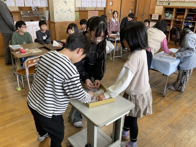外国語の学習では、ALTの先生が出したお題(英単語)を見て、班の仲間と協力してカードを探し集める活動をしました。早く集めた順にポイントがもらえるので、子供たちも熱中して取り組んでいました。