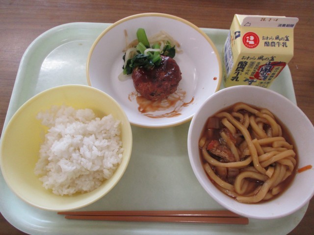 豊臣秀吉にまつわる献立として、味噌煮込みうどんと、すり身のお好みソースがけが出ました。