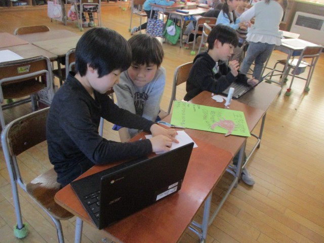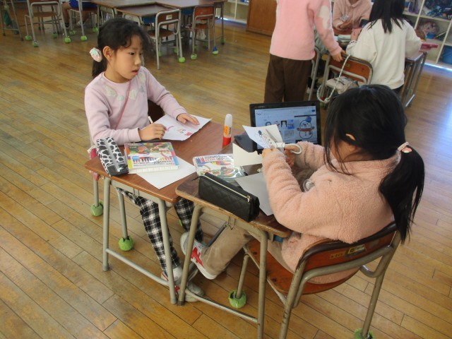 係活動では、みんなが楽しめるような企画を考えています。教室には、クイズ係のクイズや、工作係の作った絵が飾られています。運動係はリレー大会を計画中です。