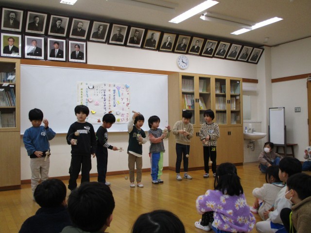 1年生からの出し物も行いました。けん玉やこま、ダンス、校歌を発表し、練習の成果を発揮することができました。