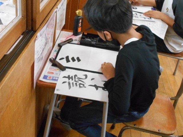 字の大きさやバランスに気を付けて書きました。子供たちは、納得のいくまで何枚も練習していました。