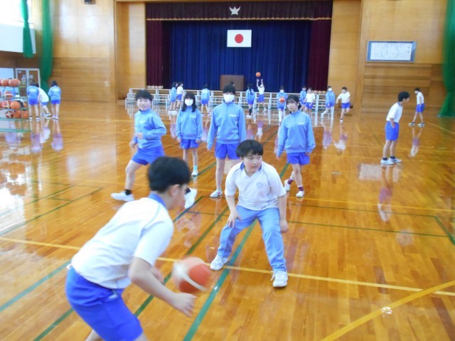 パスをつないで得点をとるゲームを行いました。子供たちは、チームの仲間と声をかけ合いながら、得点を目指していました。