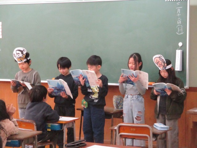 国語では、「モチモチの木」の学習の最後に、音読発表会を行いました。豆太やじさまなどの登場人物になりきって音読をしました。