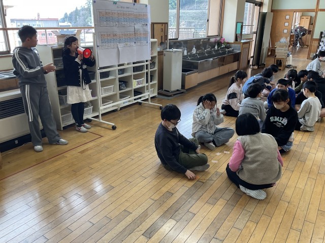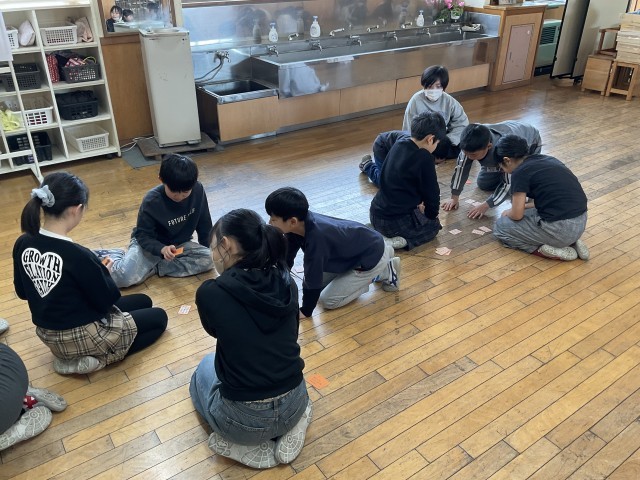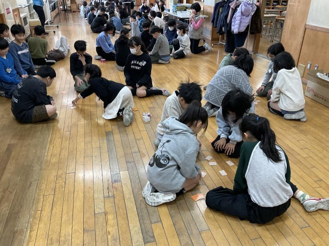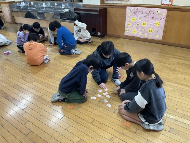 百人一首の最終戦を行いました。昨年度の記録よりも、取れた枚数が増えたかドキドキしている子供たちもいました。