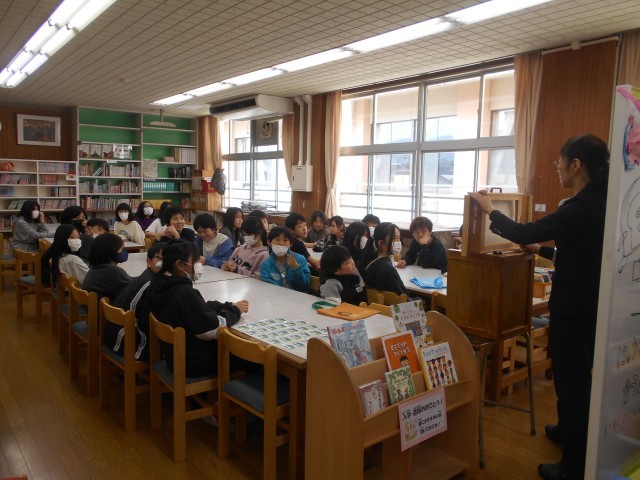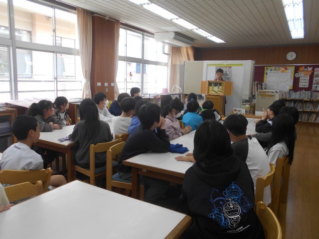 司書の先生に、6年生におすすめの本を紹介してもらった後、「杜子春」の紙芝居の読み聞かせをしてもらいました。子供たちは集中して聞いていました。