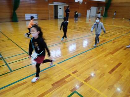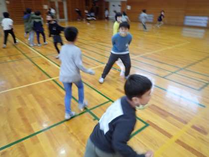 みんなが体育館に集まって少し危なかったので、何人かの子供たちと歩いたりスキップしたりしながら鬼ごっこをしました。制限があっても楽しく遊べました。