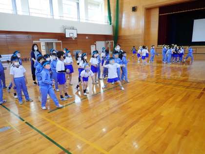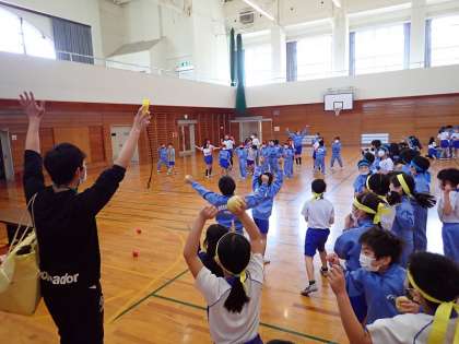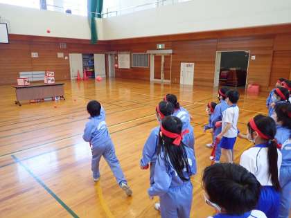 運動会で実施する「ねらいうち」を初めて練習しました。やり方が分かると、みんなで的を落とそうと一心不乱に活動していました。