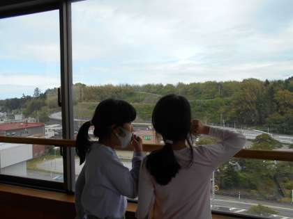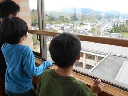 社会科の学習で展望室に行きました。 自分たちのまちを見渡し、地図を見ながら東西南北に何があるか確認しました。
