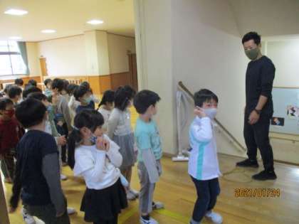 忍者のように移動するのもがんばっています。廊下を歩いていると、掃除をしてくださっている用務員さんに出会いました。ありがとうの気持ちで、大切に学校を使いたいですね。