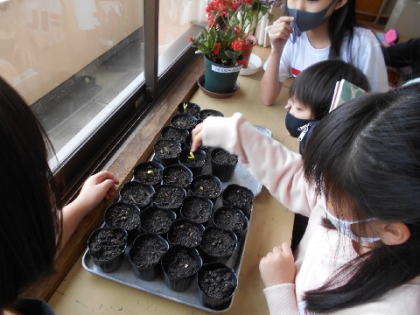 4月に種をまいて、教室で育てていたヘチマが芽を出しました。「かわいい芽だね」「ぼくの種はまだかな」と興味をもって観察していました。