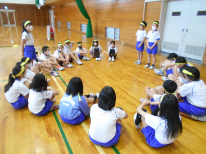 台風の目の並び方や、どのようにコーンを回れば早くなるかについて作戦を立てています。団長、副団長が中心となって、みんなで意見を出し合いました。