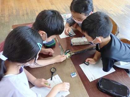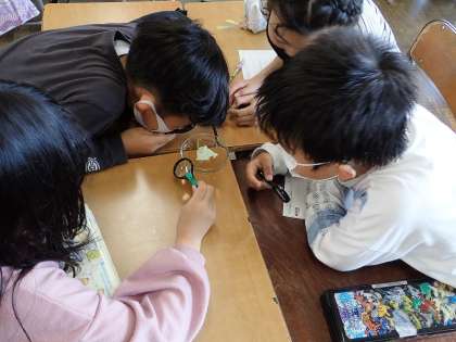 モンシロチョウの卵や幼虫を観察しました。1mmくらいの小さな卵からどんどん大きくなっていく幼虫の姿に驚いていました。