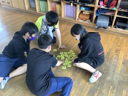 休み時間、5年生の団4役が集まり秘密の作戦会議中です。 どうやら、綱引きの並び順を考え直しているようです。