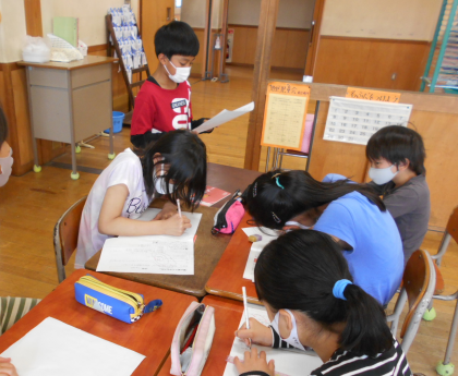 先日行ったインタビューで聞き取ったことを、グループで伝え合いました。「短い言葉でメモをとったから伝えやすい」「メモがあると忘れないよ」と、メモの良さを感じていました。
