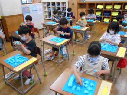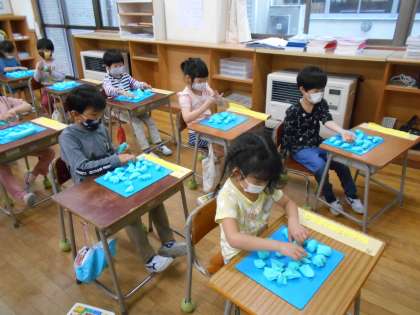 初めて粘土を使いました。たくさんちぎったり、集めたり、丸や四角三角の形を作ったりしました。最後は長いひもを作って自分の好きな形や物を作りました。
