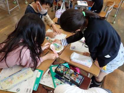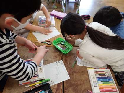 モンシロチョウの幼虫がさなぎになったので、その様子を観察しました。形が大きく変わったり、少し小さくなったりしていることや、茶色や黄緑色など全く色が異なることに、生き物の不思議を感じていました。