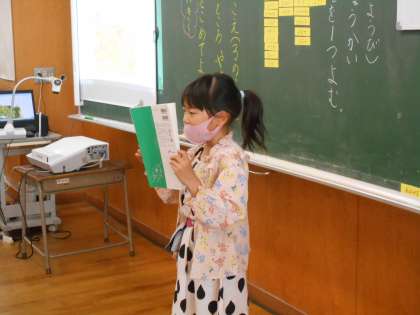 「はなのみち」の好きな場面を音読しました。大きな声で、ゆっくり気持ちを込めて読むことができました。教科書を見ずに覚えていた子供には大きな拍手が響きました。
