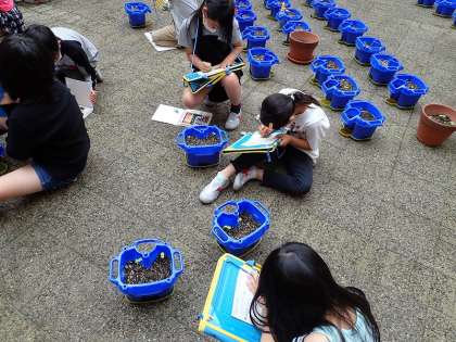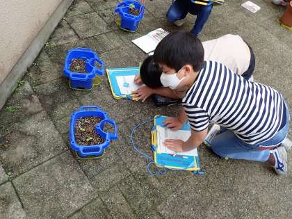 ホウセンカが発芽し、子葉が出てきたので、その様子を観察しました。自分の鉢をじっくり見て、その特徴をさかんにカードに記入していました。
