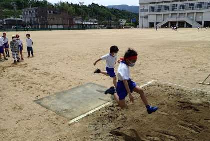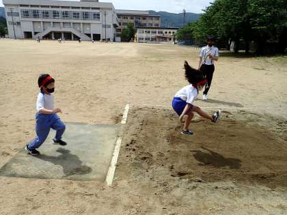 今日は、初めて走り幅跳びに挑戦してみました。踏み切る足や跳び方を確認した後、短い距離で跳んでみました。続けて練習していきたいと思います。