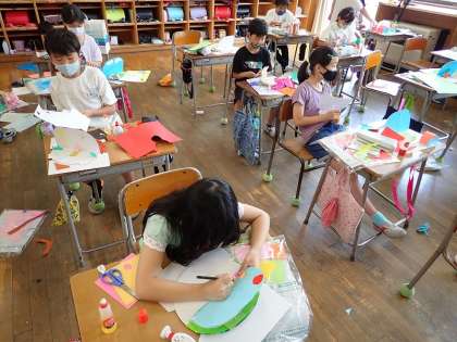 回転すると場面を変えられる「くるくるランド」を、いろいろな材料を使って制作しました。生き物や建物、道具などを、頭に浮かんだ場面になるように一生懸命作っていました。
