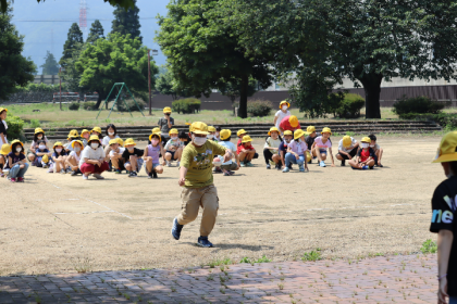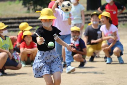 ボールと入れ物を使ったリレーを行いました。ボールの大きさや入れ物は、先生とのじゃんけんによって変わります。ボールを落とさないように気をつけて運んでいました。