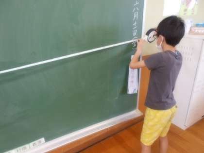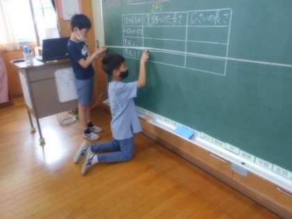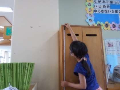算数の学習では、グループの友達と身の回りのものをまきじゃくを使ってはかりました。