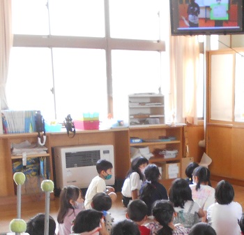 白ばとタイムに、テレビ放送で「1年生お祝い集会」がありました。