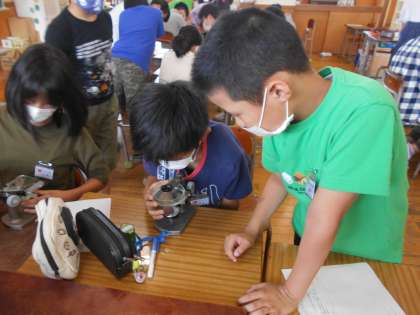解剖顕微鏡を使って、メダカの卵の観察を行いました。「目がある!」「なにか動いてる!」など、思い思いの言葉を発しながら興味津々で観察していました。