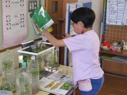 みんなが待ちに待っていためだかがやってきました。めだかを迎えるために、この1〜2週間、めだかについてたくさん調べたかいあって、みんなの用意した水槽とペットボトルの中でめだかも気持ちよさそうに泳ぎだしました。